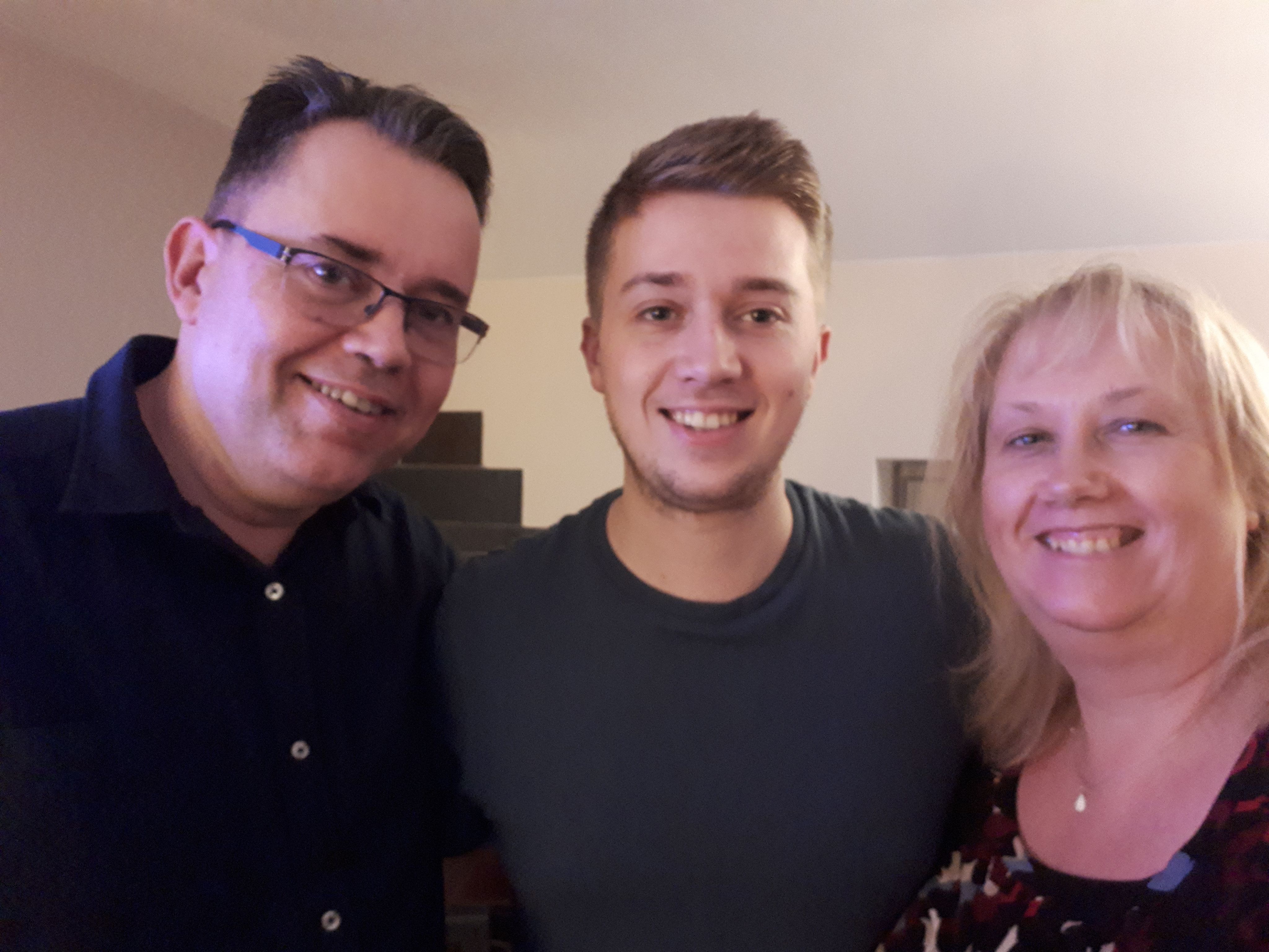Sam's parents, Debbie and Mark, with Sam.