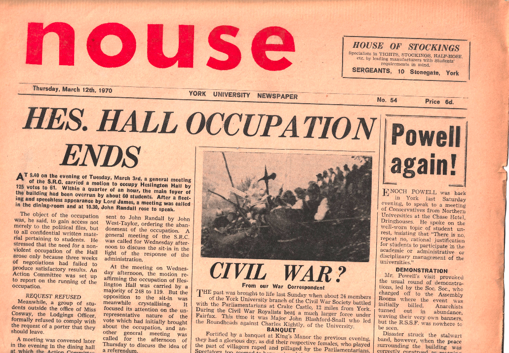 Excerpt from student newspaper Nouse, March 1970. 'Hes. Hall Occupation Ends.'